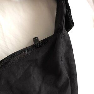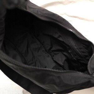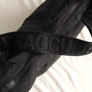 Practical and popular BAGGU crescent bag. This is in the size medium, with the 37.5" strap. Can be used crossbody or as a shoulder bag. Made of recycled heavyweight black nylon with a recycled ripstop nylon lining. Has a top zipper and two zippered pockets inside. You can fit everything in this bag! Feels very heavy duty. Carried it very lightly for a couple weeks but it wasn't quite my style.