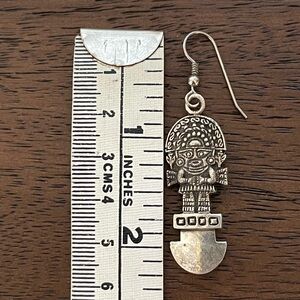 This is a gorgeous pair of Mayan / Aztec sterling silver earrings. They are my favorite and look amazing on the ear. I had two pairs of them and this is my last one. Measures 2.25 inches including their hoops. Stamped 925 for sterling silver and in great vintage condition.