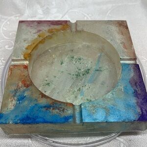 This is a piece art that will bring a little color into any room. Some of the ashtray looks likee a foil look . You would not find this in the store. You don’t have to use this as an ashtray you can sit near the door and put keys in pocket change jewelry or sit on the desk as a paperweight set pens in it. It’s more a piece of art than an ashtray.