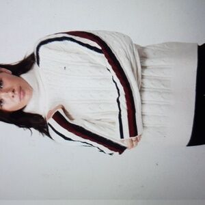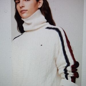 over size style Stay cozy and stylish with this white turtleneck sweater featuring chic striped sleeves. Perfect for any casual outing.lenght 37inch