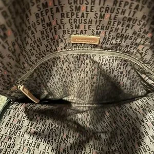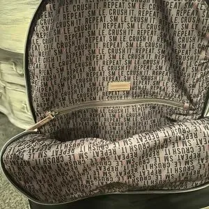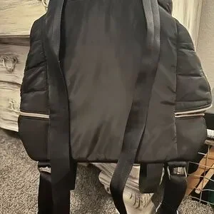 Stylish black quilted backpack perfect for everyday use. Features a sleek design with ample storage space. Straps at bottom for yoga mat and big pocket for shoe storage. Side exterior pocket and interior pocket. Used burning good condition with little wear other than a couple snags on bottom fabric. Shown in pictures. Clean interior!