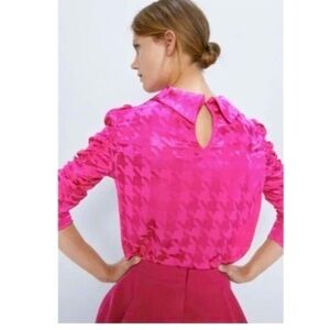 Zara Houndstooth Satin Pink Ruched long sleeve