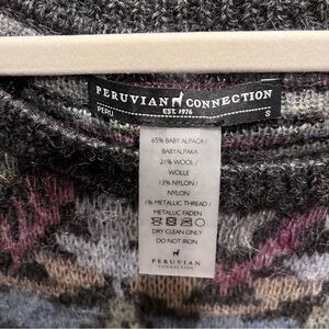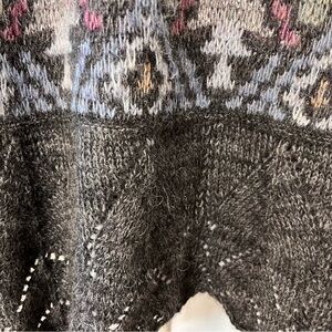 Super fun multi colored baby alpaca fiber blend knit sweater dress. Gray blue burgundy multi colored pattern. Slight silver metallic thread throughout. Crocheted hem. Super cozy soft fabric. Very Good used condition. No flaws just typical sweatery fluff per usual with alpaca fibers. Perfect over tights or leggings.