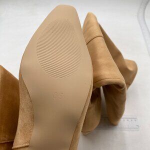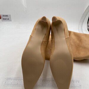 NWT Women Stretchy Knee High Boots Closed Square Toe Low Kitten Heel Nude