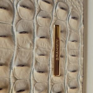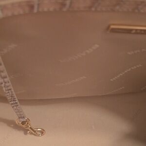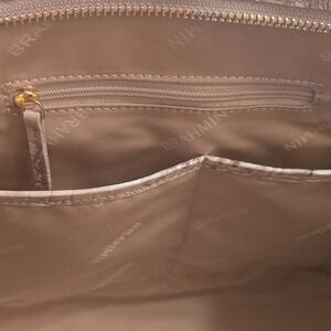 One pocket outside. Zip and jewelry pocket. pen pocket and key fob plus 2 slide pockets. There is no dust bag.