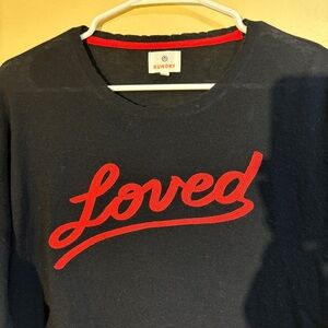 Sundry “Loved” red and black sweater made of merino wool and cashmere. Sold on Revolve, now SOLD OUT. Features a slit on either side. Tag says size 1, which is a small according to the website.
