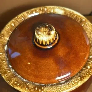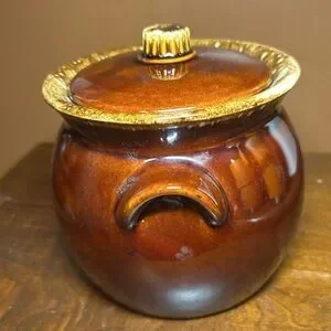 Vintage Hull Pottery USA bean pot with lid. Beautiful brown glazing. Measures 7 inches tall & 6 inches across. I believe this is the 2.5 quart size. Great condition and does not appear to have been used for cooking. Very small glazing divot & chip in lid. No crazing or cracks. Displays beautiful.