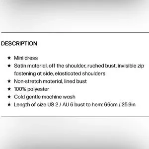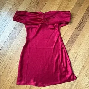 Princess Polly Sadee Mini Dresss, Red, size US2, satin material, off the shoulder, ruched bust, hidden side zipper, NWT
