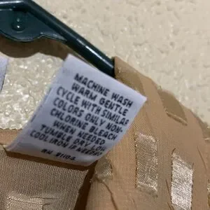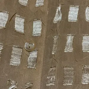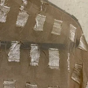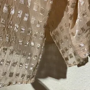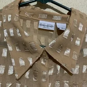Material: see picture-no stretch, long sleeve, a bit shiny, see through, 7" side slits, light weight, collared, polyester, machine wash