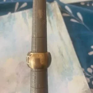 The ring is beautiful with surface scratches that do not take away from the beauty. Please look at photos and ask questions. Sold as is.