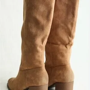 These heeled boots by ARULA feature a soft suede texture in a warm tan color. With a sleek silhouette and a rounded toe, they offer a sophisticated and versatile look suitable for various occasions. Wide calf fit.