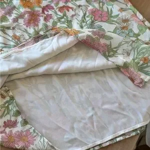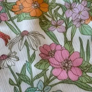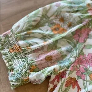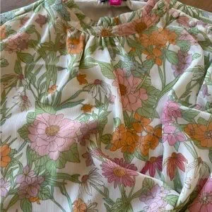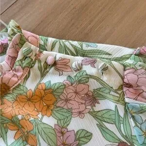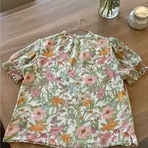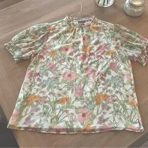 Floral garden print, pull over with 4 button enclosure on left sleeve, ruffled neckline, perfect top to dress up or pair with jeans, shorts & sandals/tennis shoes. Size Large