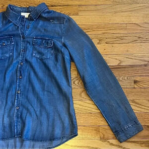 Love Stitch Dark Wash Blue Button Down Long Sleeve Denim Shirt | Size Large