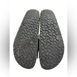 These shoes are preowned with wear. Notably there is some discoloration on the foot bed from normal wear and the bottom of the sandals shows signs of use. There is some marks on the strap as pointed out and on the strap there is a slaw of a raw hem. Minimal staining, scuffing, and worn soles are considered normal. Please inspect pictures to make sure they are up to your standards and reach out with any questions.