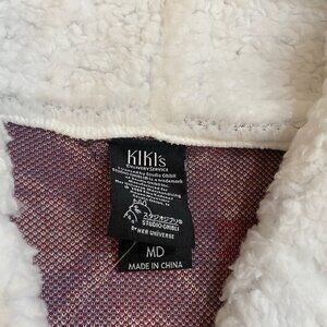 This is a size M Studio Ghibli Kiki's Delivery Service Jiji Fair Isle cardigan from Hot Topic. The cardigan features a tight-knit, long sleeve design in a multicolor polyester material with a knit fabric type. It is a juniors size with an open front style and showcases a Movie theme. The cardigan is branded by Studio Ghibli and perfect for women looking for a unique and stylish addition to their wardrobe.