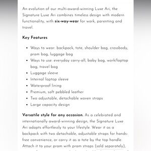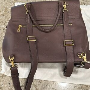 Luxe Ari leather bag. Fig color that is no longer available. Beautiful large diaper bag that has been very gently used. Comes with changing pad. Two of the elastic pockets started to come apart and I stitched one back together but not the other-as pictured. So many pockets! Can be worn multiple ways. Dust cover included.