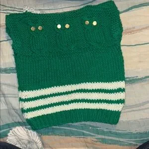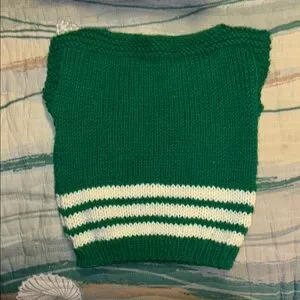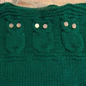 VINTAGE Charming green knit vest with owl design. Features white stripes and button accents. Perfect for layering.