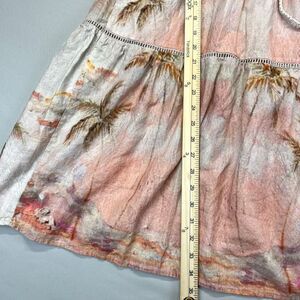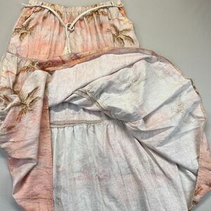 Beautiful tiered maxi skirt in a soft linen-rayon blend fabric featuring a subtle tropical palm tree print in coral and neutral tones. Three-tiered design with delicate ladder stitch trim between tiers. Elastic waistband with decorative rope tie and tassel detail. The fabric has a lovely drape and airy feel perfect for warm weather. Made from 55% linen, 45% rayon blend. The skirt is in good pre-owned condition with no significant flaws or damage. Measurements available in photos.