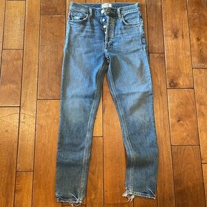 Size 25 with distressing at the hem. These jeans are in excellent condition, only worn a small handful of times. Super comfy and great quality.