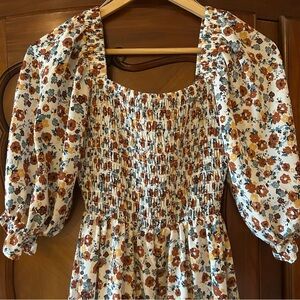 Really cute Jessica Simpson smocked dress with a 3/4 puff sleeve. There is a riffle at bottom. I wore this with brown boots and cowgirl belt. My hubby loved it. Size XS