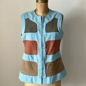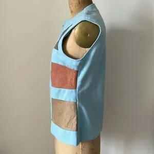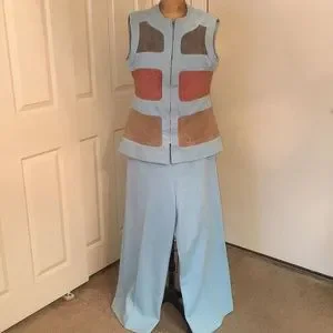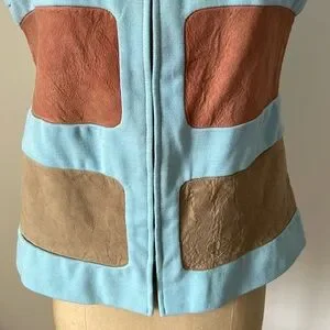 Genuine Vintage 1970’s light blue knit 2 piece pants leisure suit. Zip front vest with genuine suede patches on front of vest in colors: green, orange and brown. Fits size medium or size large. Excellent condition!