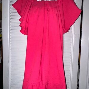 This vibrant pink blouse features an off-the-shoulder neckline and flutter sleeves that create a flouncy feminine look. The relaxed fit and ruffled details add to its airy and billowy appearance, making it perfect for a stylish outing.
