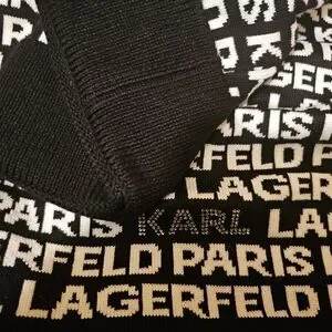 NIB Karl Lagerfeld Paris black and white hat , scarf and gloves set. The set is still attached to the gift box but please note the top left corner of the box and lid has been cut. Each piece has KARL written in silver rhinestones. It really is a beautiful set.