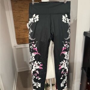 Stylish black leggings with floral print. Perfect for workouts or casual wear. Comfortable and trendy.