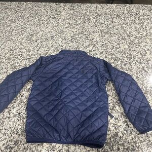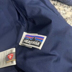 Lightweight but warm Patagonia jacket. Dark navy blue. This has been used but still has a lot off life left in it. Absolutely adorable on and is great for in a hurry and need an extra layer for warmth. Sticker for name tag at day care had a little too much adhesive and left a little behind. Check out the photo for reference. You can only see it if up close but you can see from the picture the jacket is still super cute and in good shape.