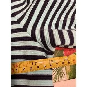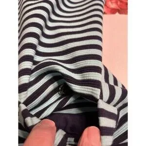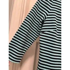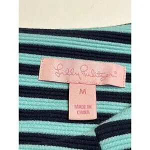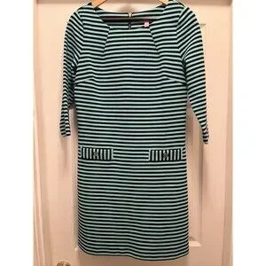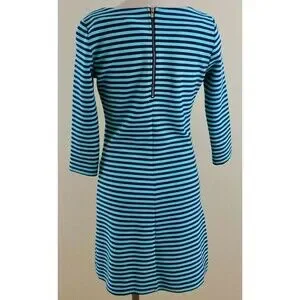 This Lilly Pulitzer dress in size M features navy and aqua blue stripes with gold button accents. The 3/4 sleeve design has a boat neck and a zip closure. Made of polyester, cotton, and elastolefin, this above knee length dress is suitable for various occasions like travel, parties, casual wear, work, or business. The shift style with front pockets and stretch fabric makes it a versatile and stylish choice for summer, fall, and spring.