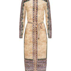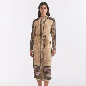 A sandy-etched base on the Molly-D Dress in Mandisa Stripe is adorned with an ornate geometric border, creating a unique visual appeal. Its long sleeves, tie waist, button front fastening, and a relaxed fit make it a statement style.