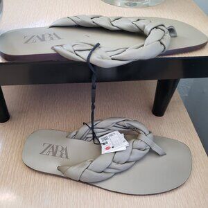BNWT ZARA leather chunky braided flat thong sandals (7.5) olive