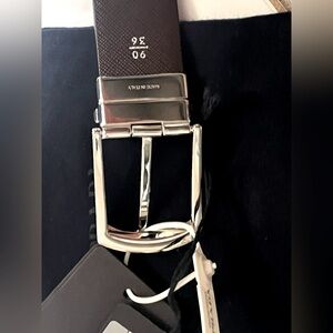 Elegant black leather belt with a sleek silver buckle. Features the iconic Prada logo. Perfect for adding a touch of luxury to any outfit.