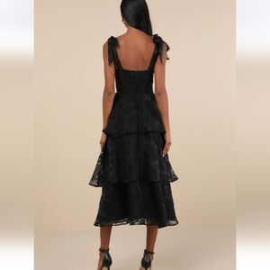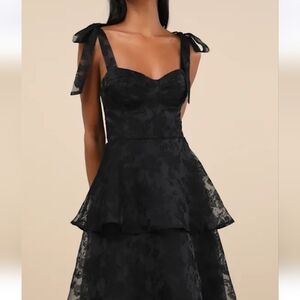 NWOT. This glamorous black layered dress is perfect for any special occasion. Its sophisticated design features a flattering silhouette and delicate layers. Ideal for making a stylish statement.