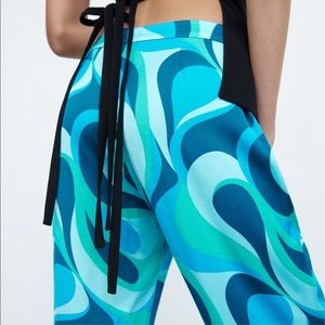 ZARA Silky Bold Blue Groovy Print The Safia Satin Effect Button Zip Flare Pants