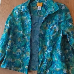 This listing is for a Pre-owned Ruby Rd. Lightweight Blazer Jacket. This is beautiful shades of Blue and Green. It has a Zip Closure and is a size 8P. This jacket is 48% Rayon, 47% Polyester and 5% Linen