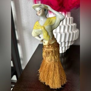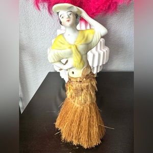 Really unique and elegant vintage porcelain broom lady with fabric at top of broom. Some fabric has dissolved with age around waist of lady. Could be repaired or left as is. In beautiful vintage condition. Perfect for the collector.