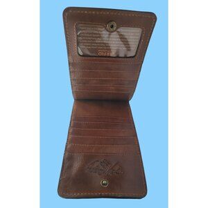 - Interior: 1 ID window, 10 card slots, deep embossed logo; leather trim, nylon lined