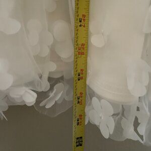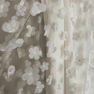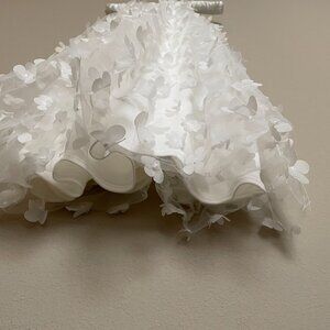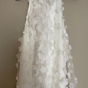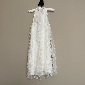 New with tags and stunning. New York and company featured brand, Lena, 3D White Floral dress. This is a midi length sleeveless halter neck dress with a sheer layer that features 3D floral accents and is bursting with femininity, The back ties in a bow. This would be stunning for a photo shoot or a special occasion.