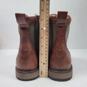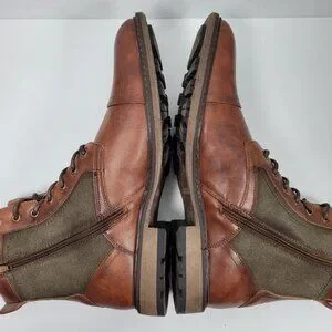 These Madden boots combine style and functionality with their lace-up and side zip design. The blend of leather and canvas materials offers durability and comfort, making them a versatile choice for various occasions. The rich brown and olive tones add a touch of rugged sophistication to your wardrobe.