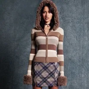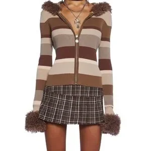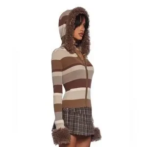 Stay cozy and stylish with this striped brown jacket featuring faux fur trim. Perfect for adding a touch of warmth and elegance to your outfit.
