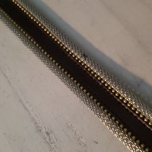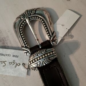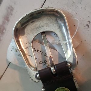 NWT some rack wear evident. Heavy leather and metal mesh trimmed belt with quality tooled buckle and tip, gold grommets and ball trim. Cool statement/western belt despite it's imperfections.