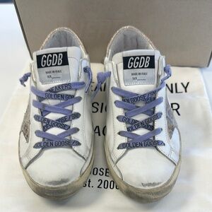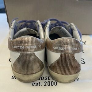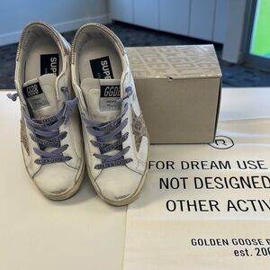 Stylish Golden Goose sneakers with purple laces. Features a unique design and comfortable fit. Perfect for casual wear.