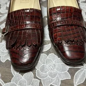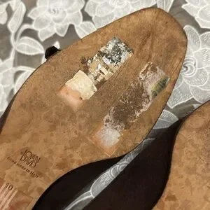 Gorgeous Joan & David loafers with heel. Size 10. Fringe & buckle detail. Hand made in Italy. They do not show materials used anywhere but this is an expensive brand so I am sure they are high quality materials. Overall good pre-owned condition with lots of life left. Some wear / peeling on the black bottom part of heel. A few small nicks / scuffs. Price and brand sticker is embedded on bottoms as pictured. Please see picture.