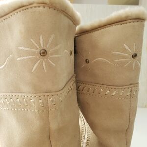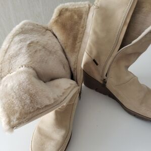 Beautiful cream suede boots with soft faux fur interior and wedge heels. And boho stitched details around the top.