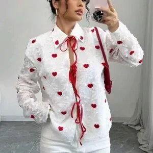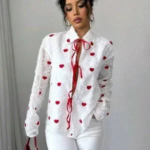 Valentine's Day Heart Cutout Tie Front Women Blouse, Red