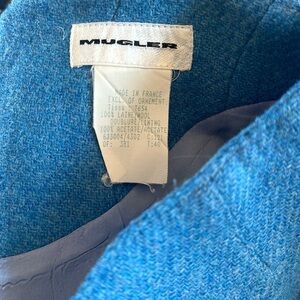 Mugler Vintage Blue Wool Tweed Mini Pencil Skirt. Above knee/ thigh length. Good condition but please note a couple tiny holes noted while photographing