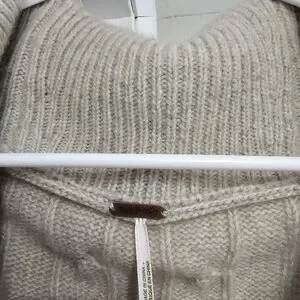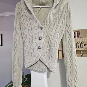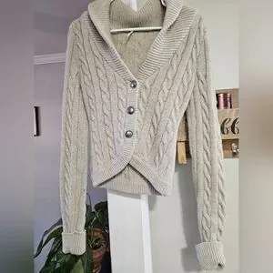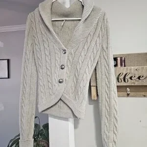 Free people viceroy cardigan in slightly cropped style. Wool blend with cable knit design and shawl collar. Silver buttons with blue detailing. Not an oversized fit.