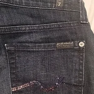 pre-owned 7 For All Mankind junior jeans. Known for their high-quality denim and stylish designs, these jeans are a must-have for any fashion-forward individual. Featuring a classic five-pocket design and a straight-leg cut, these jeans offer both style and comfort. The dark blue color adds a touch of sophistication, making them perfect for various occasions. These jeans have been kept in a smoke-free and pet-free environment, ensuring they remain in excellent condition.