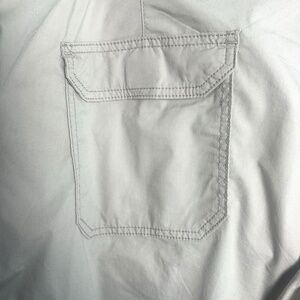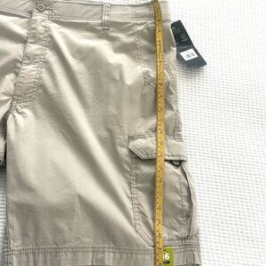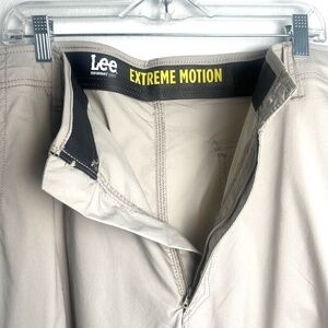 Brand new with tags, Lee Men's Extreme Motion Crossroad Cargo Shorts in Size 46. Stone beige khaki. Lightweight and comfortable stretch waistband. Relaxed fit, mid-rise, knee length, zip-fly button closure. Two back flap pockets with no closure, two side cargo pockets and two regular pockets.